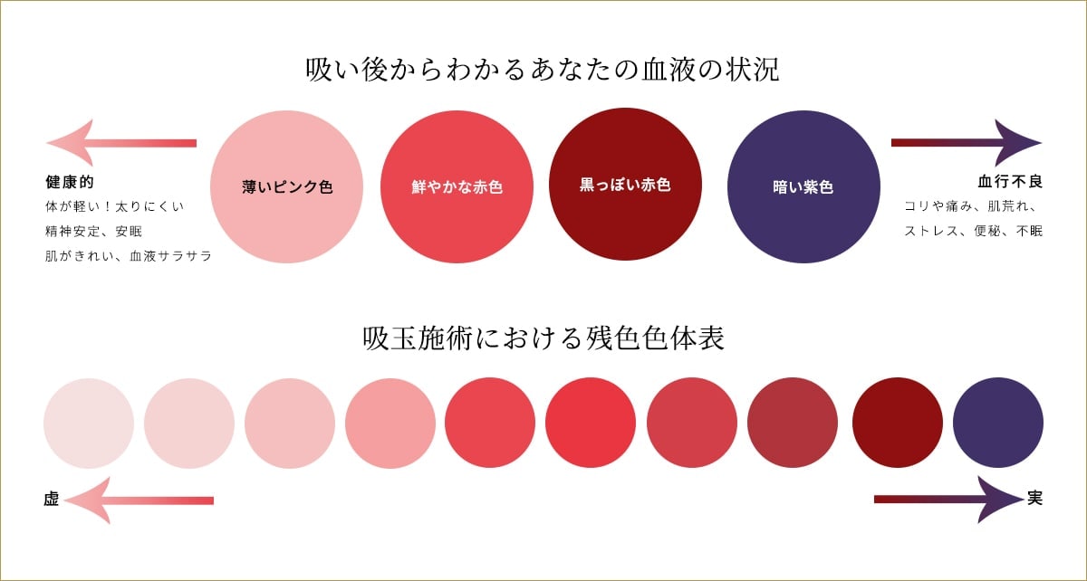 血行不良こそが万病のもとという考えのもと、於血(おけつ)と呼ばれるドロドロした血液を吸引し血行へのアプローチで体温が上がります。コリがほぐれ、痩せやすい体質に近づくと言われています。